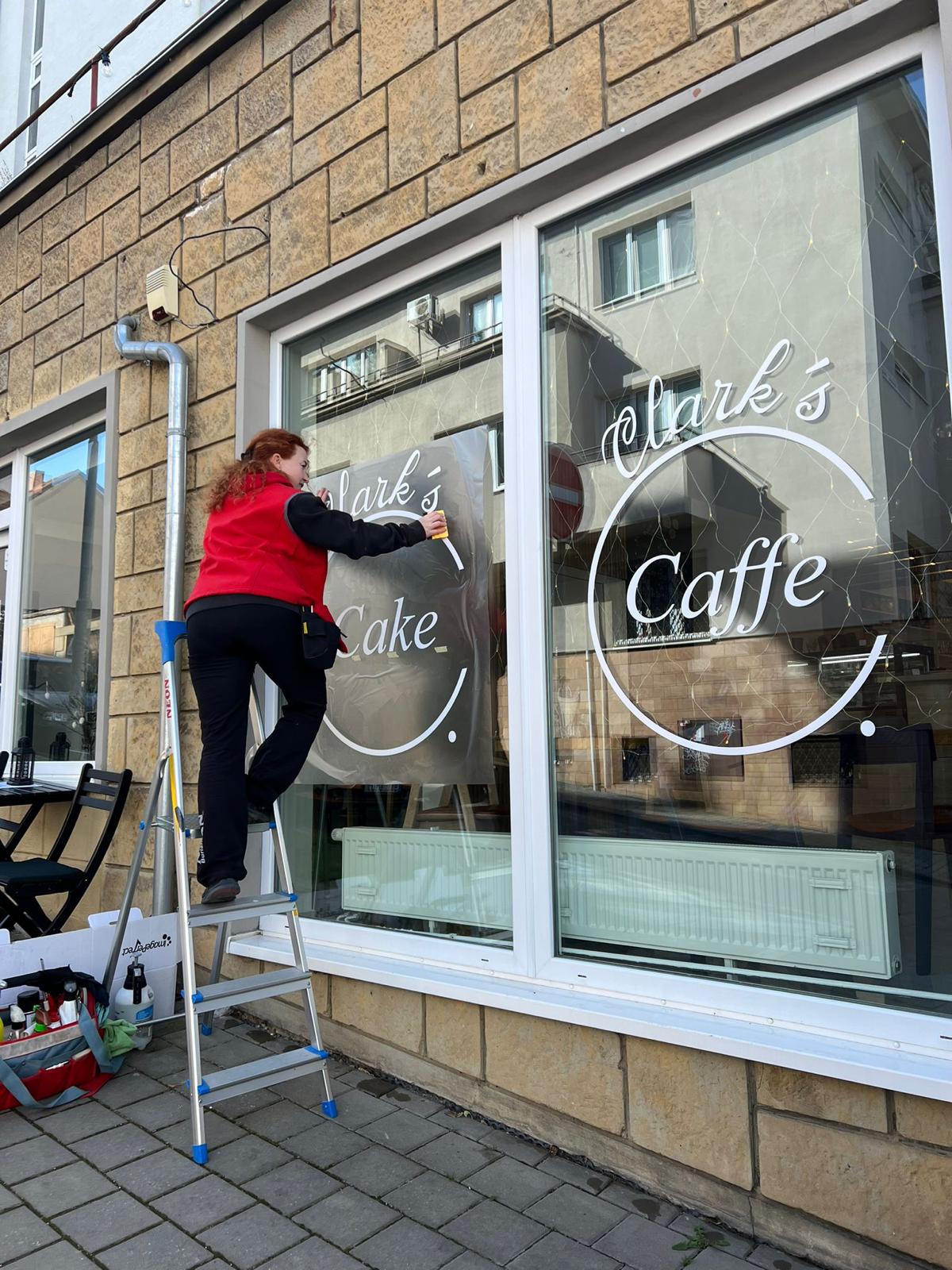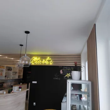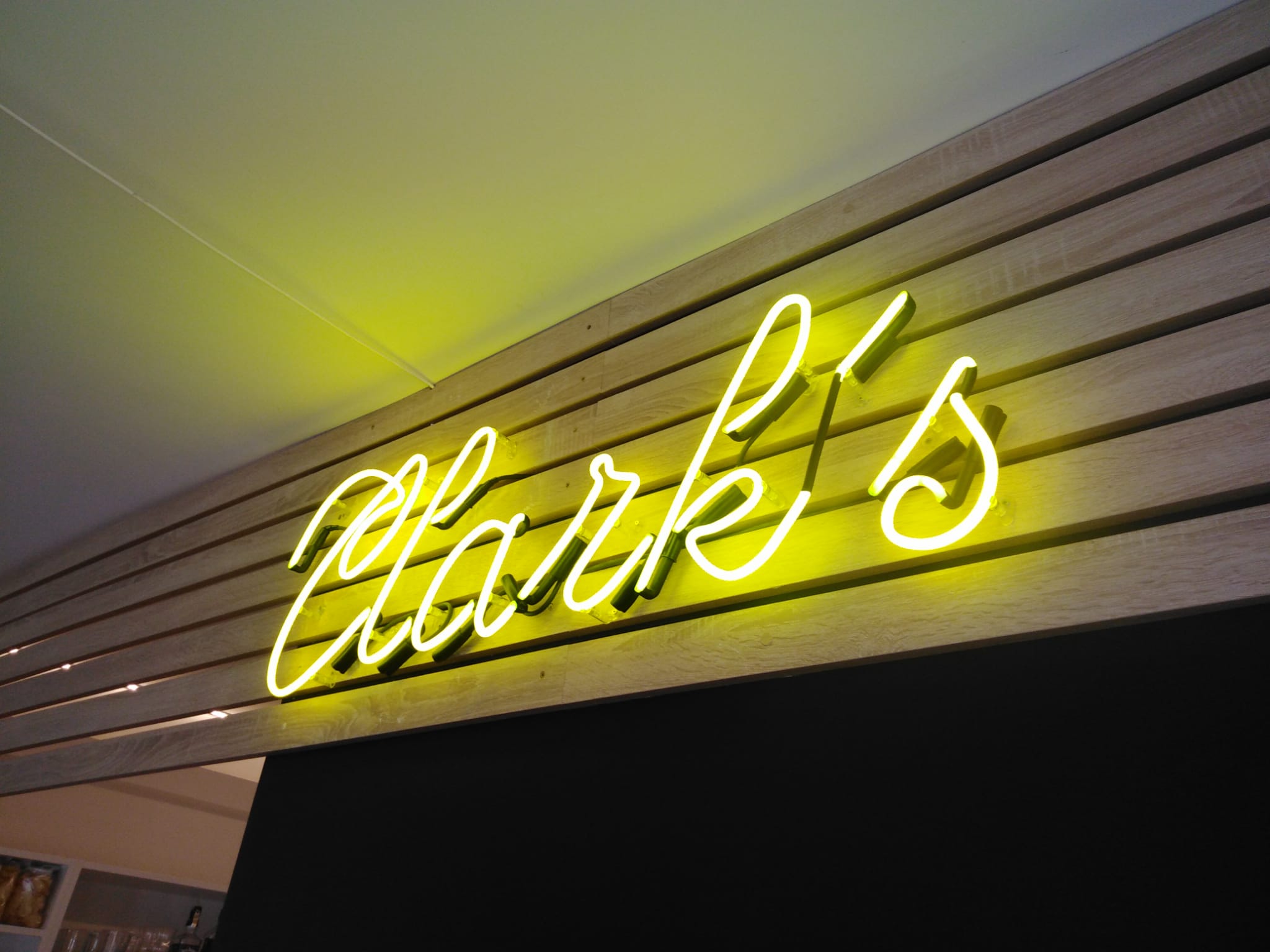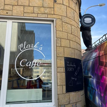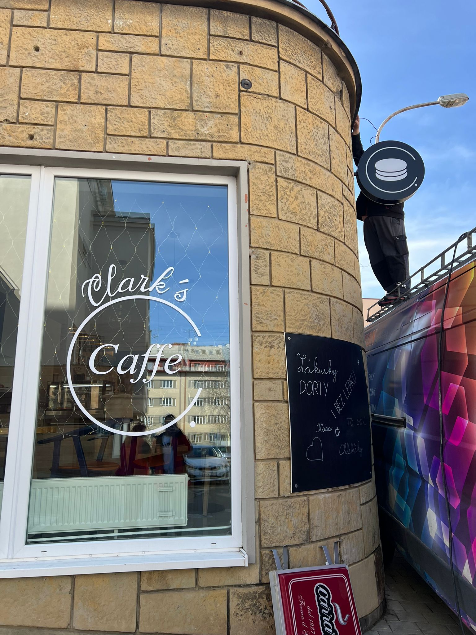 Pro novou kavárnu - cukrárnu Clark’s jsme realizovali neonový nápis Clark’s, který tvoří hlavní světelný identifikační prvek provozovny. Výlohy byly doplněny o grafický polep s logem, který podporuje vizuální identitu značky. Součástí realizace je také výstrč s logem makonky, zajišťující dobrou čitelnost a orientaci z ulice.