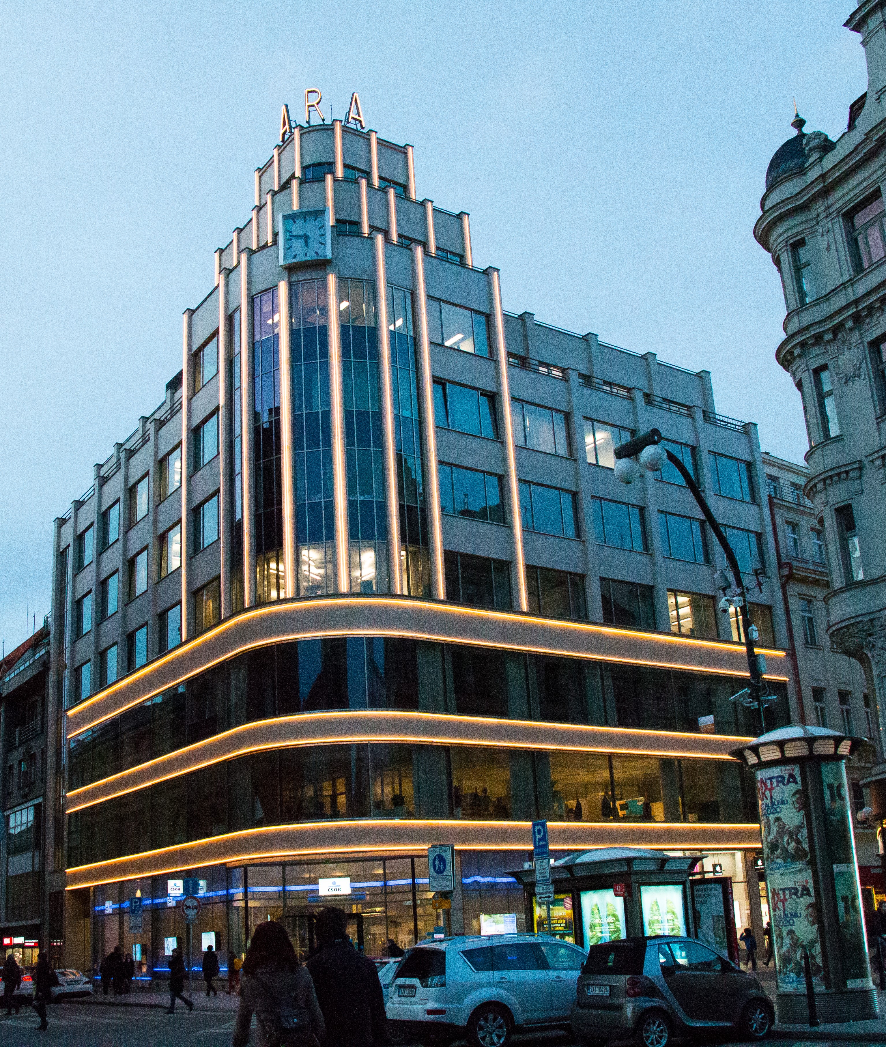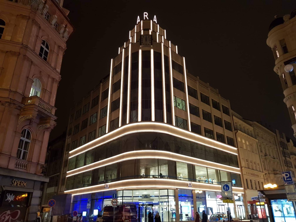V roce 2017 nás oslovila firma Art Kodiak s.r.o. s poptávkou instalovat na budově ARA v Praze (28 října / Perlova) neonové zařízení dle požadavku Úřadu památkové péče v Praze. Jednalo se o kopii původního neonového osvětlení budovy.