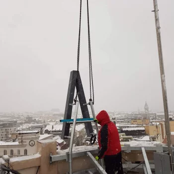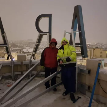 V únoru 2019 ráno napadl sníh, přijel objednaný jeřáb a začal se vznášet po jednotlivých písmenech nápis ARA. Ještě že jsme si předem připravili a osadili konstrukci. Naši montéři pracovali až do setmění, ale povedlo se.