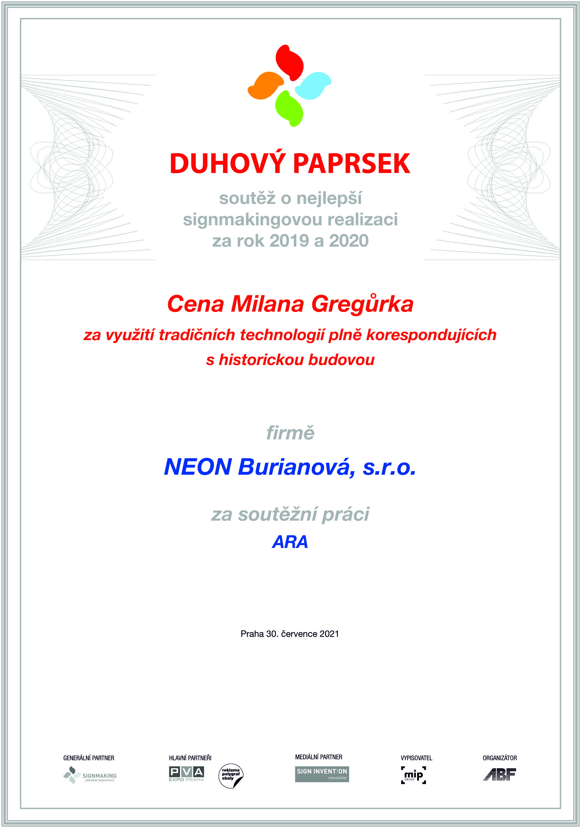 Pan Milan Gregůrek je zakladatel (1999) a ředitel firmy Dencop Lighting spol. s r.o.. Je jedním z největších odborníků v ČR ve výrobě neonové reklamy. Bohužel, v tomto roce 2021 pan Milan Gregůrek umřel. Proto je nám velkou ctí, že jsme získali toto ocenění, které je velkou poctou jeho osobě.