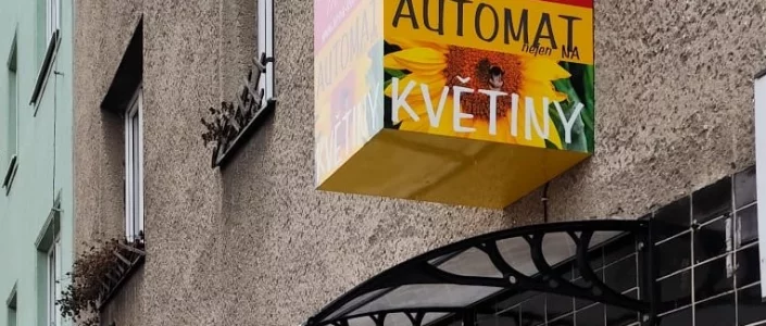 Klientka požadovala výstrč nad automat na květiny, která bude čitelná ze tří stran. Z konstrukčního hlediska byla proto zvolena světelná krychle z plexiskla, která umožňuje rovnoměrné prosvětlení a dobrou viditelnost ze všech směrů.