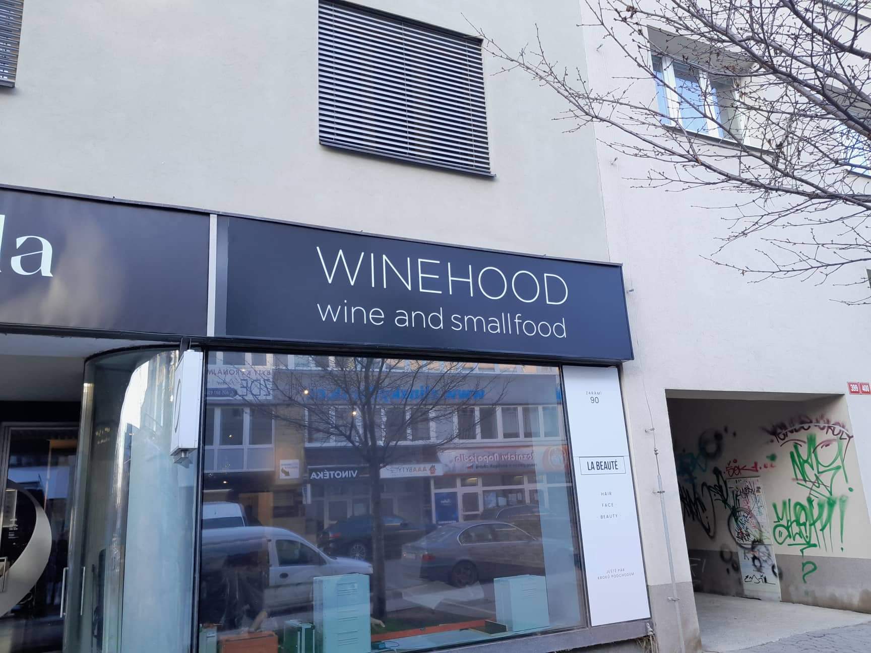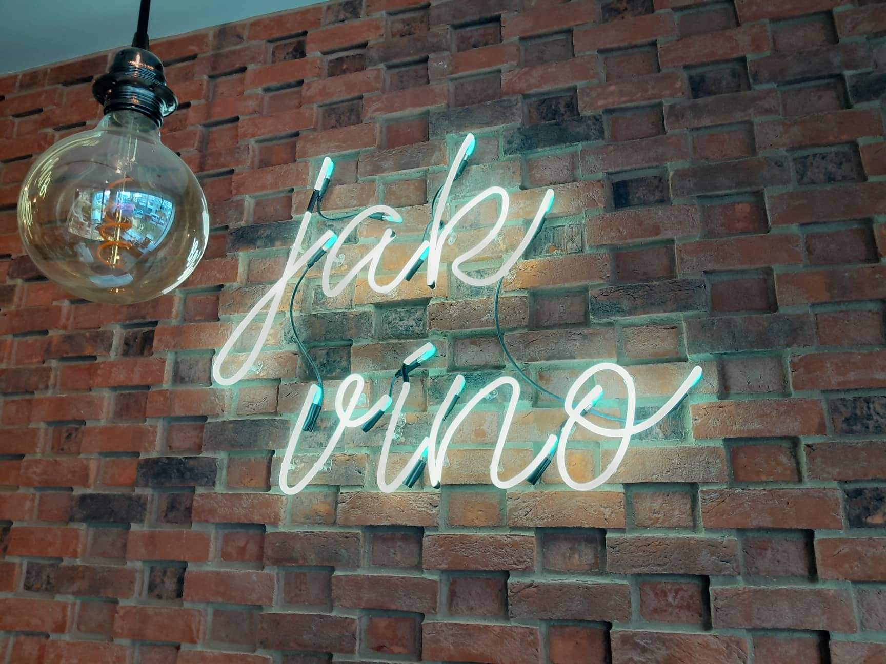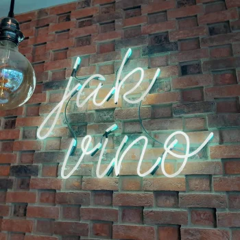 Neonový nápis instalovaný na cihlové stěně vytváří výrazný atmosférický prvek a podtrhuje charakter prostoru. Tradiční technologie neonu v kombinaci s hrubou strukturou cihel působí autenticky a vizuálně přitahuje pozornost. Venkovní označení provozovny je zároveň důležitým orientačním prvkem, který zvyšuje viditelnost a identitu místa.