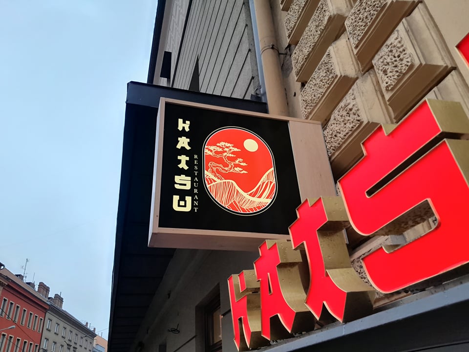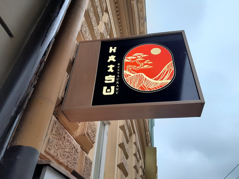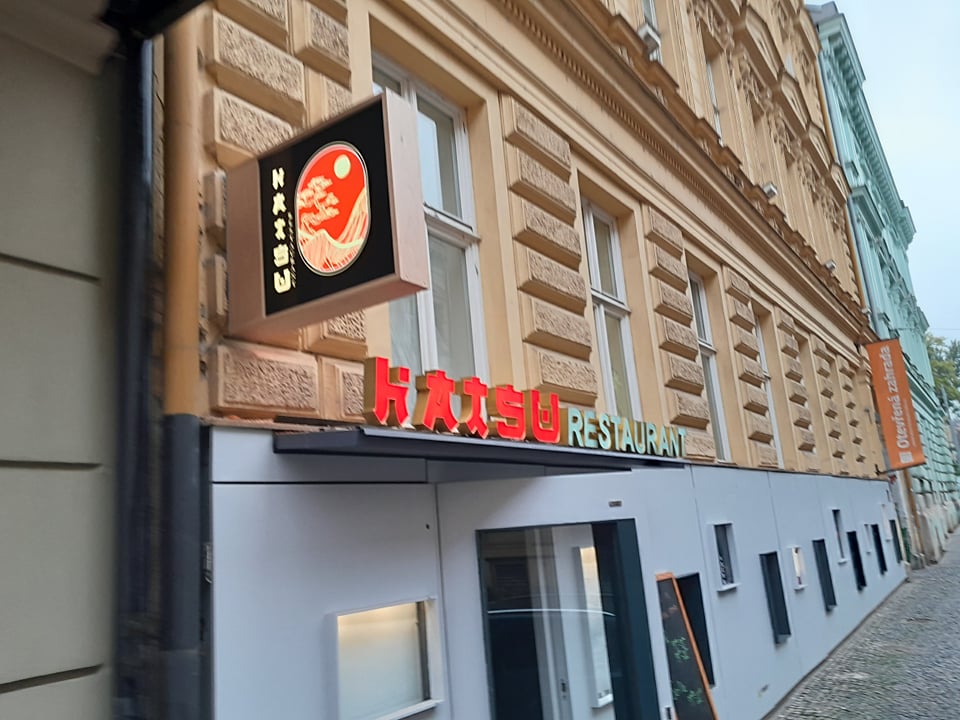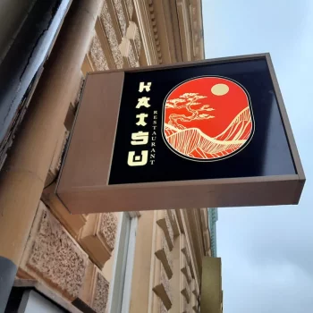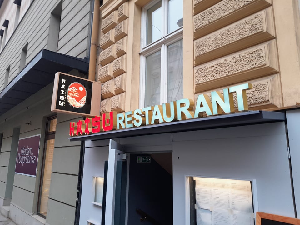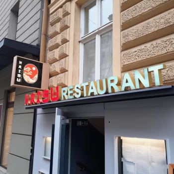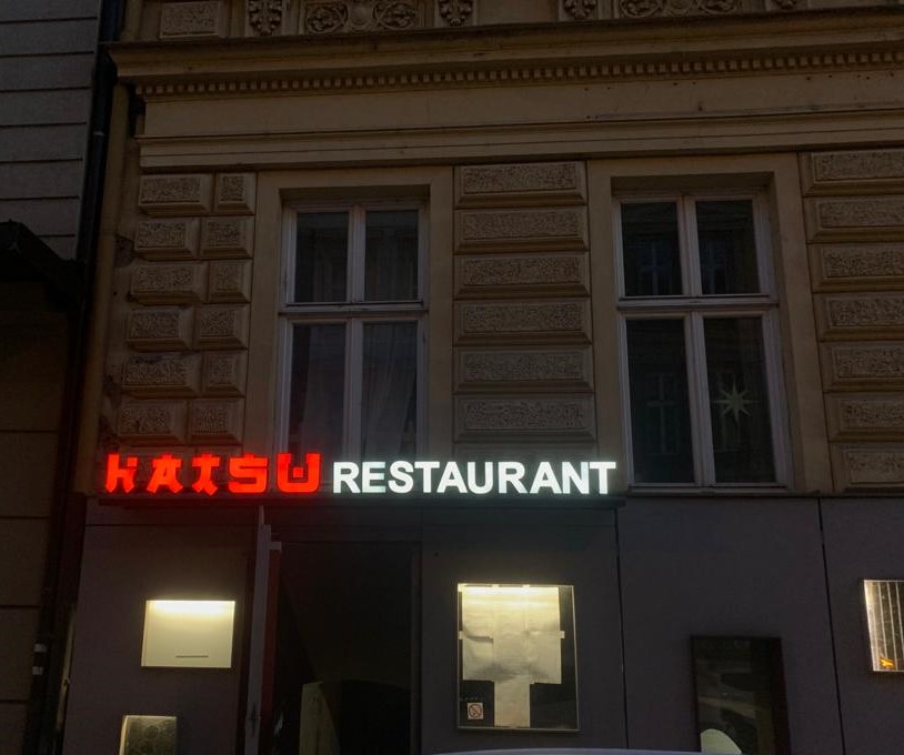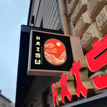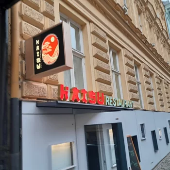 Světelný nápis HATSU RESTAURANT – vietnamská kuchyně je navržen v důrazné červené barvě s bočnicemi v zrcadlové zlaté. Kombinace s Black & White nápisu vytváří výrazný kontrast a dobrou čitelnost.