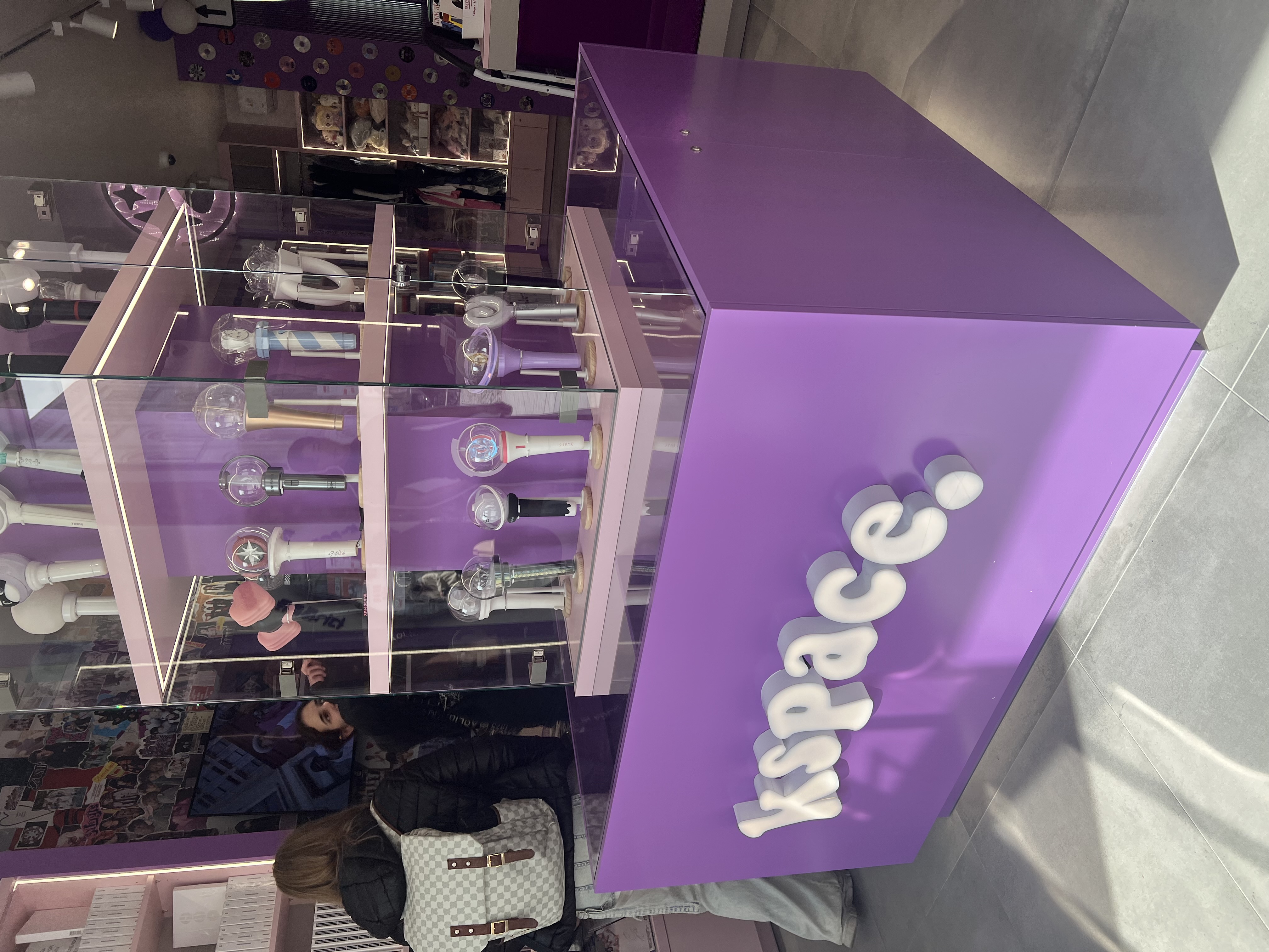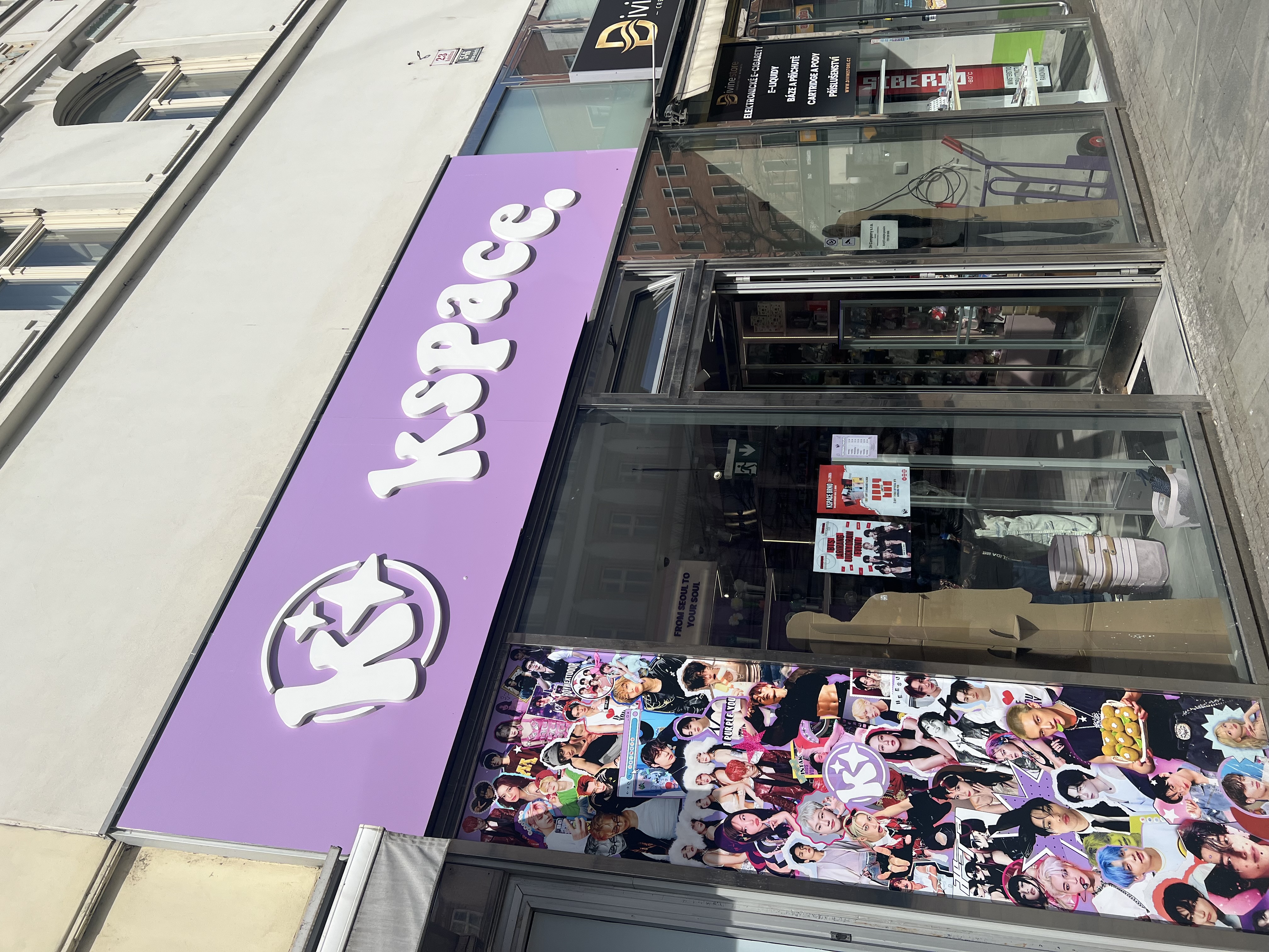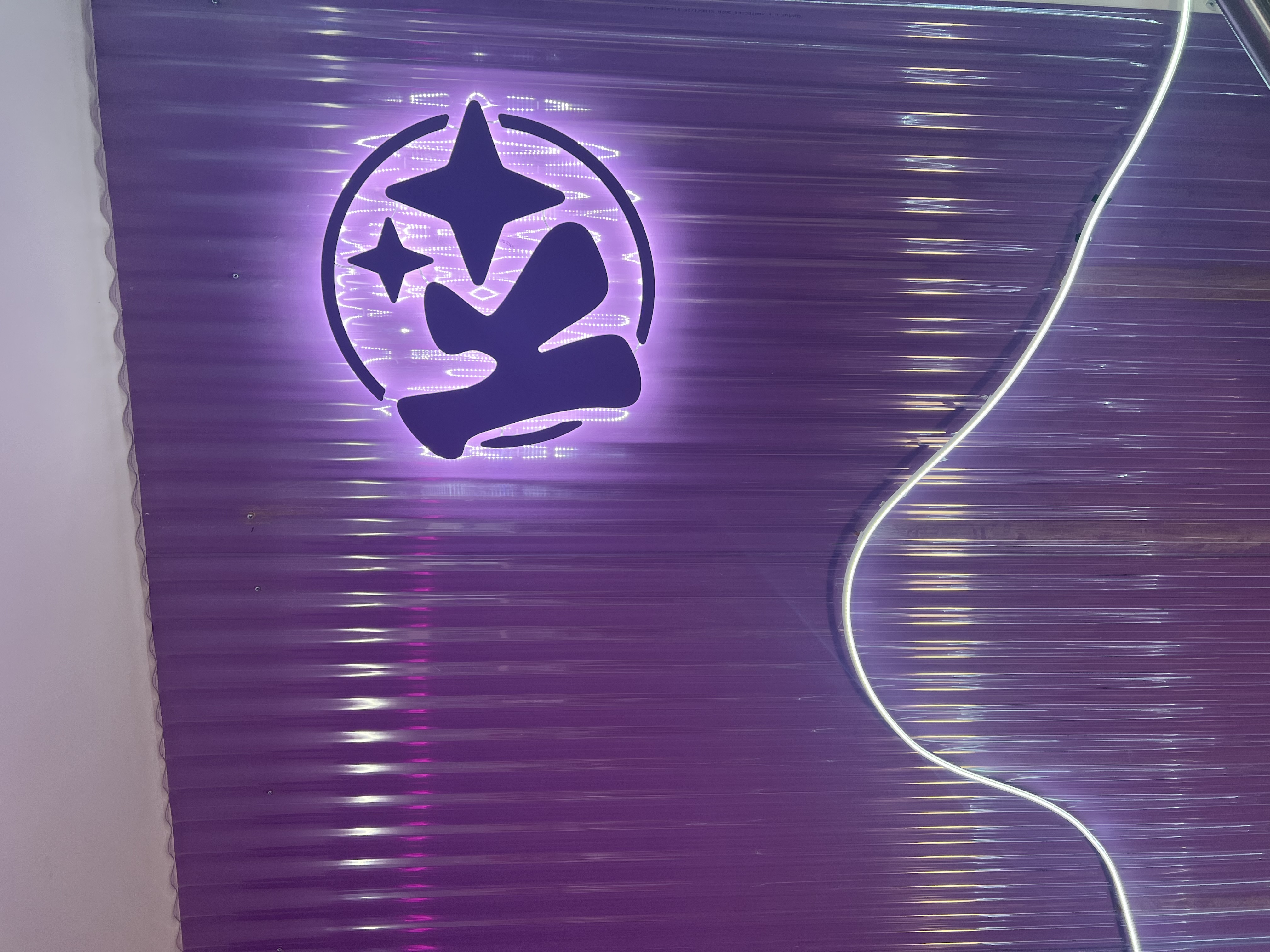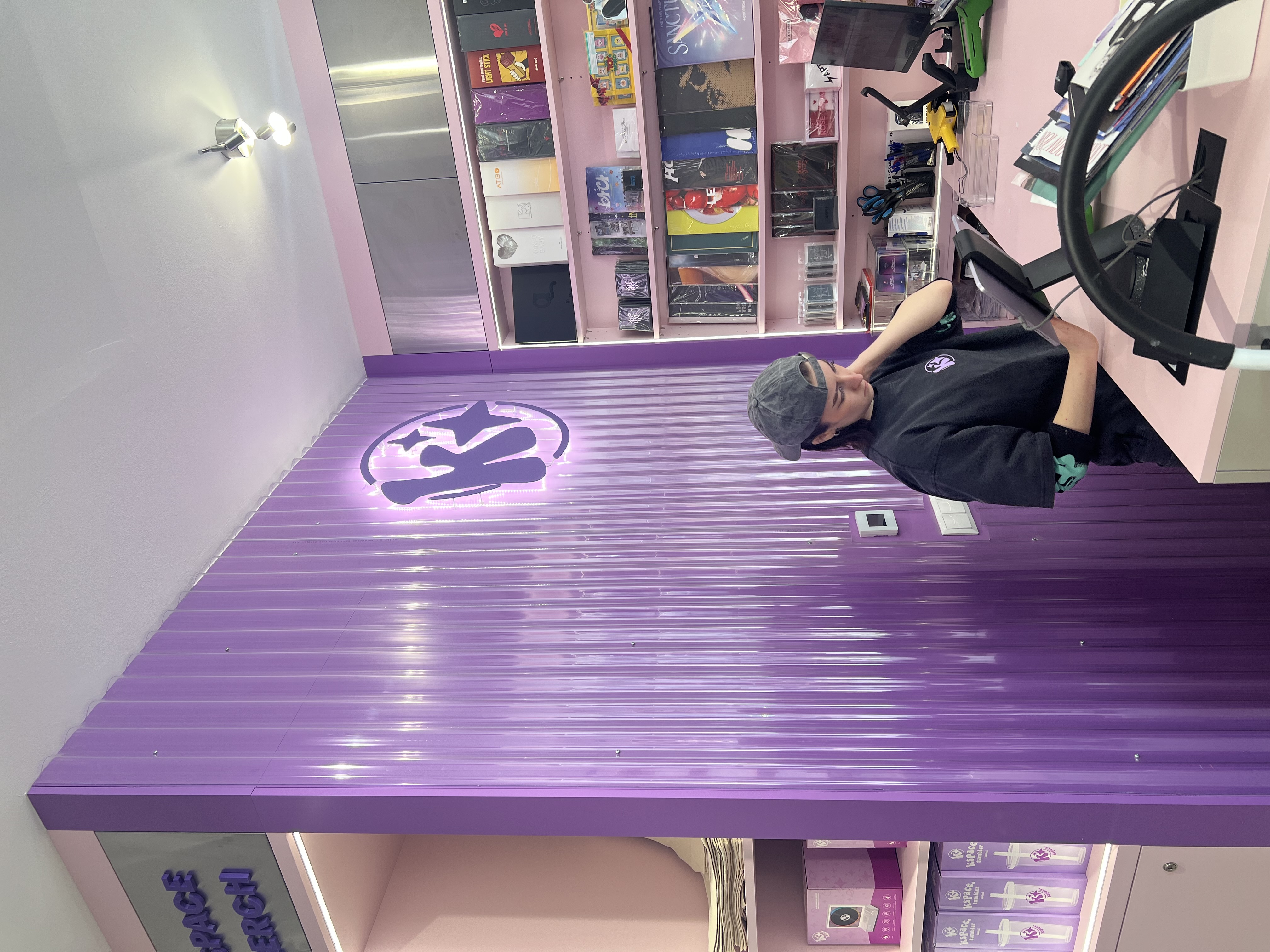 Dominantou interiéru jsou světelné nápisy na pultu a světelná loga na stěnách, které vytvářejí výraznou atmosféru a podporují vizuální styl prodejny. Veškeré popisy a označení jsou řešeny pomocí 3D písmen vyrobených technologií 3D tisku z filamentů v přesném odstínu fialové barvy.