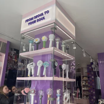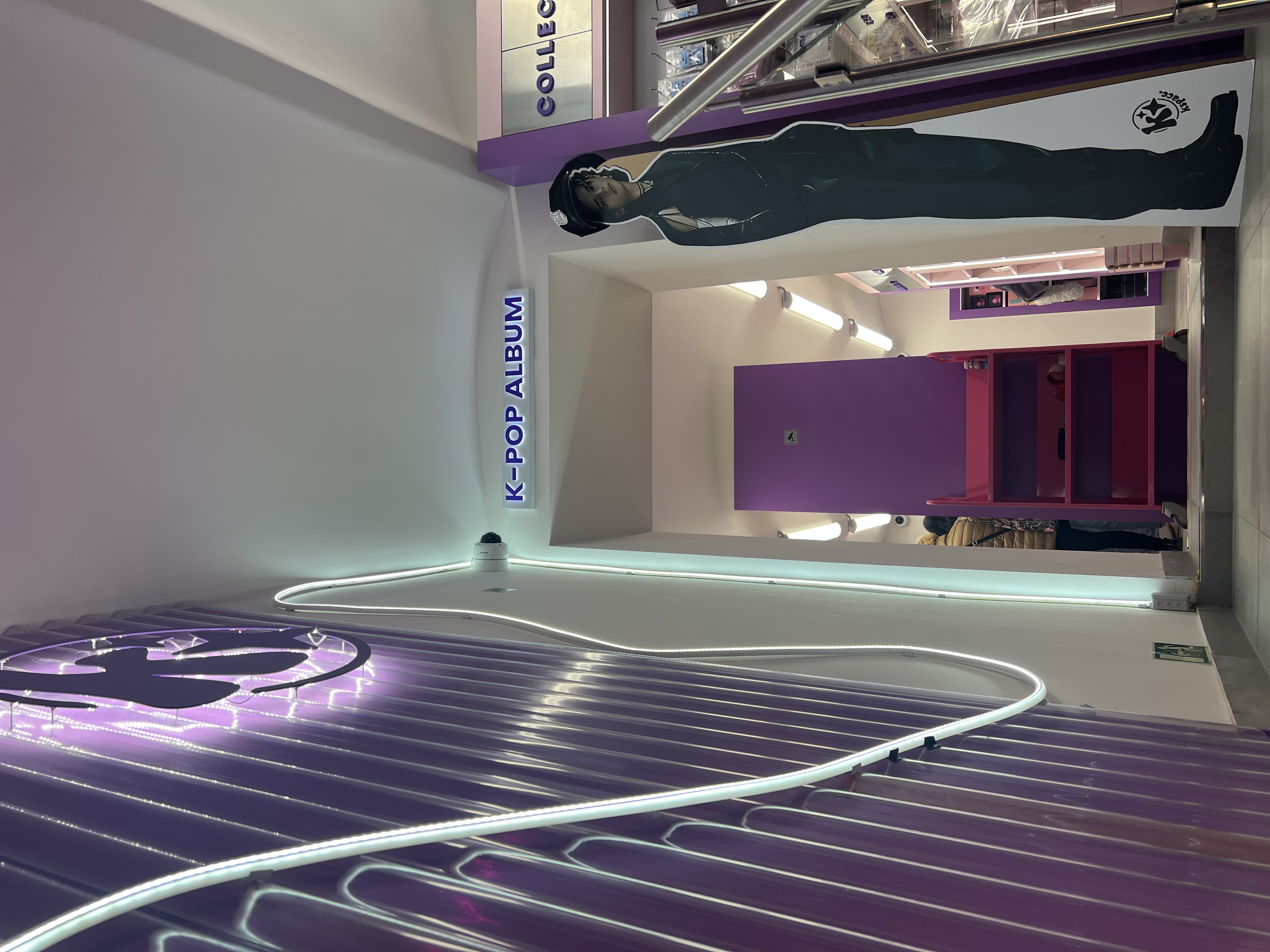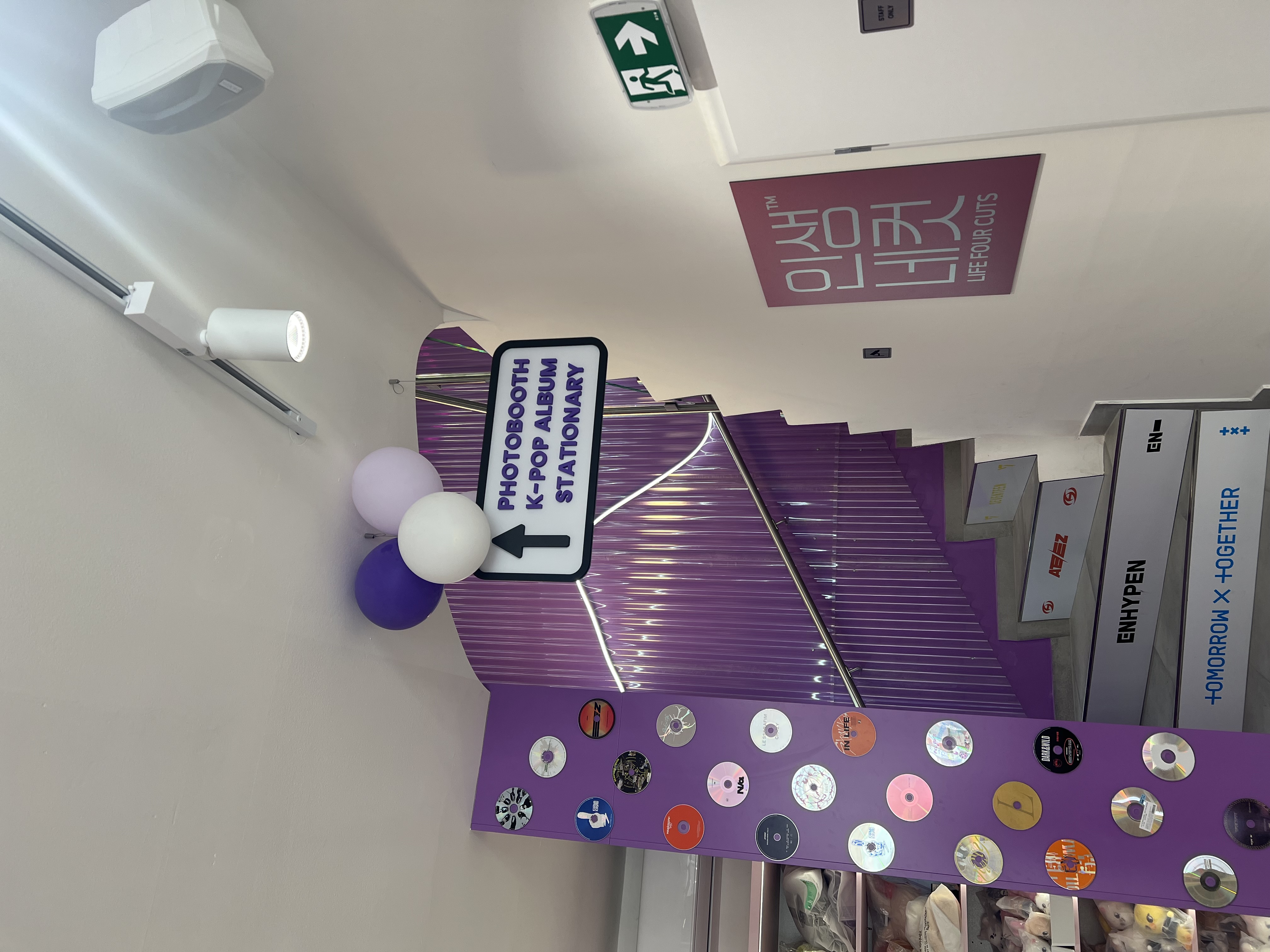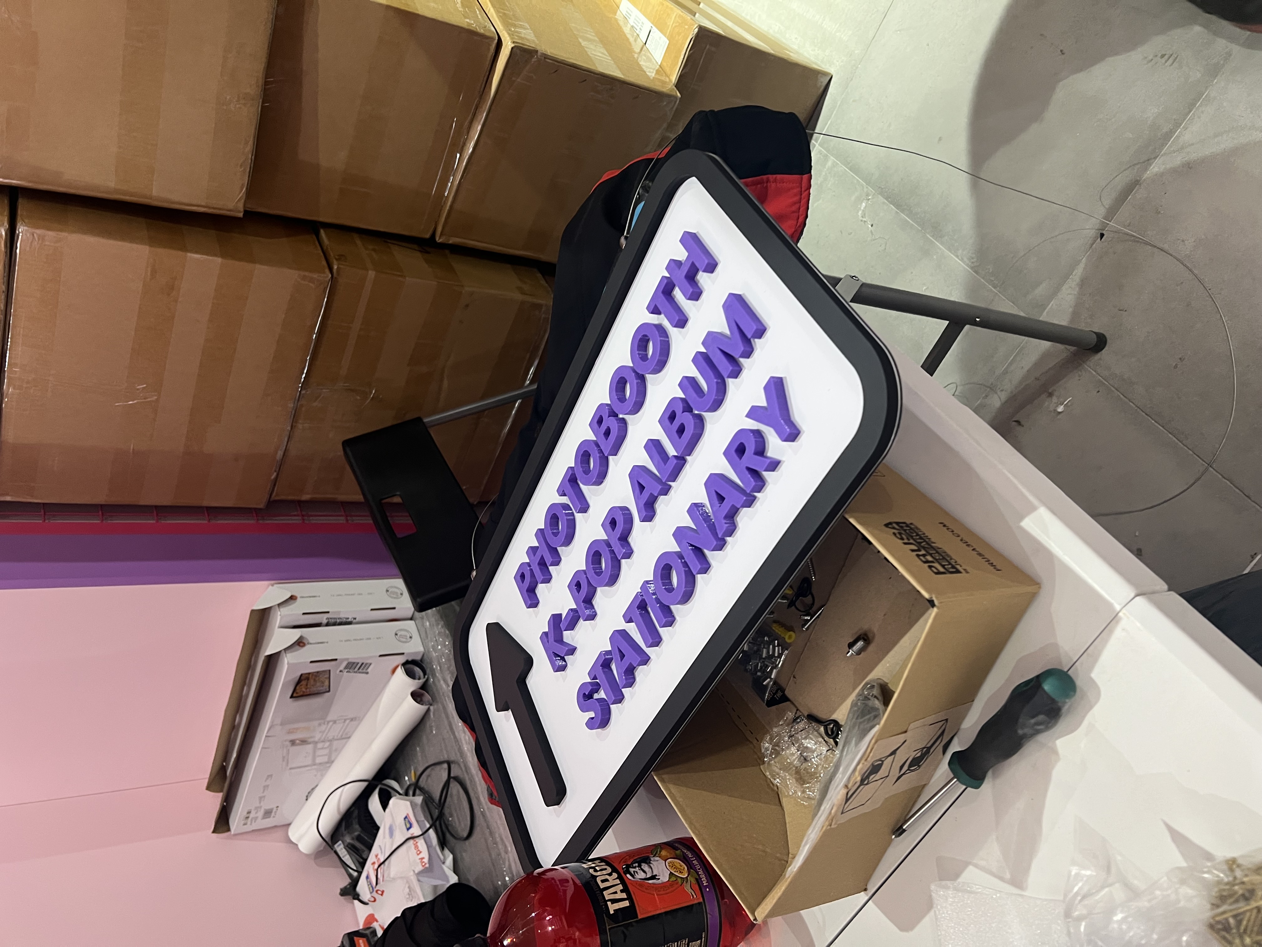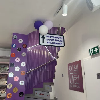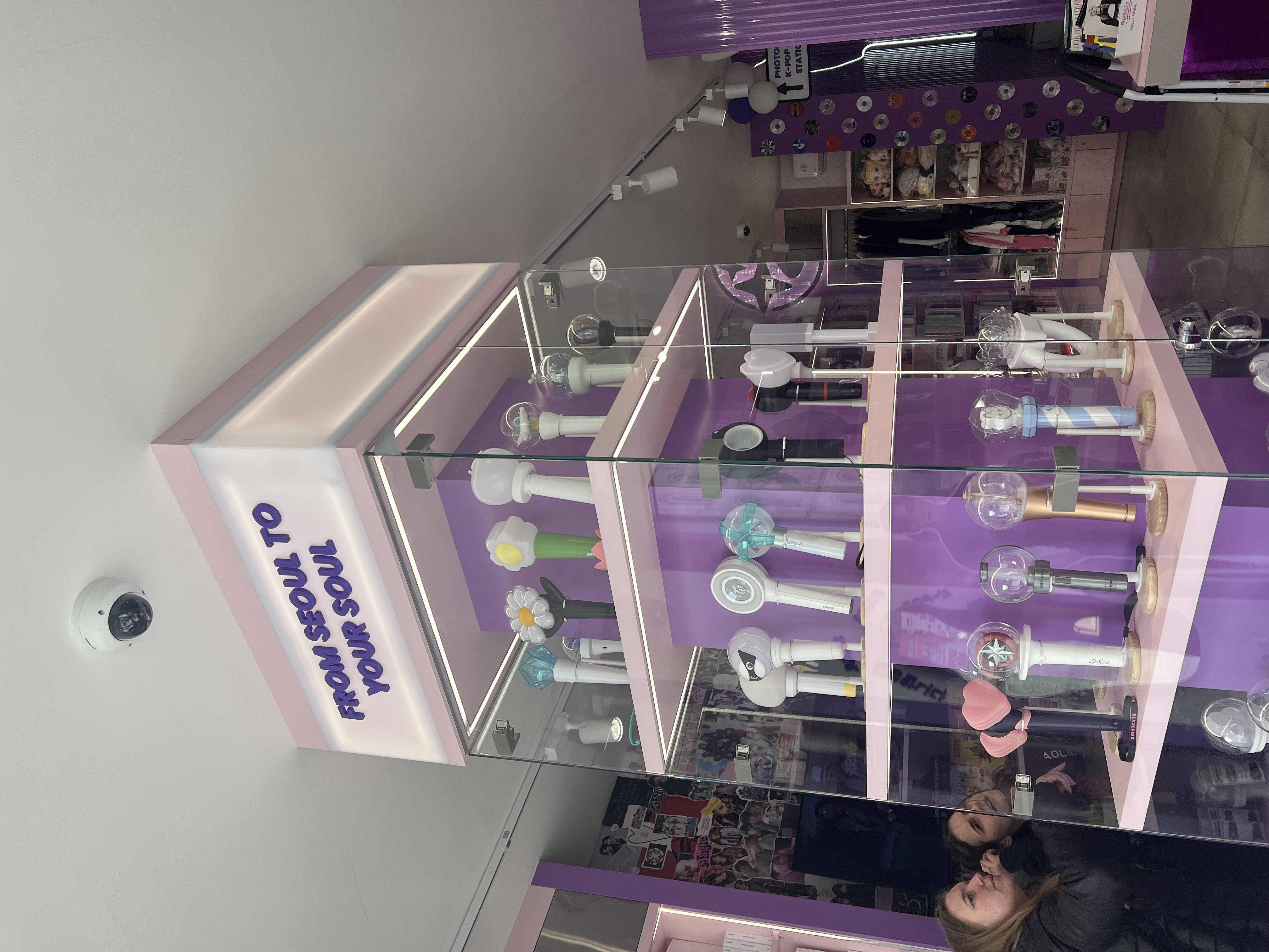 Dominantou interiéru jsou světelné nápisy na pultu a světelná loga na stěnách, které vytvářejí výraznou atmosféru a podporují vizuální styl prodejny. Veškeré popisy a označení jsou řešeny pomocí 3D písmen vyrobených technologií 3D tisku z filamentů v přesném odstínu fialové barvy.