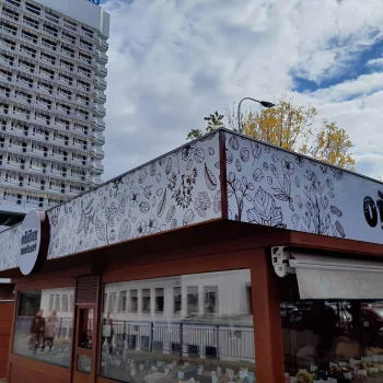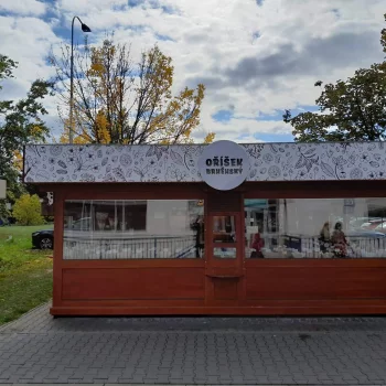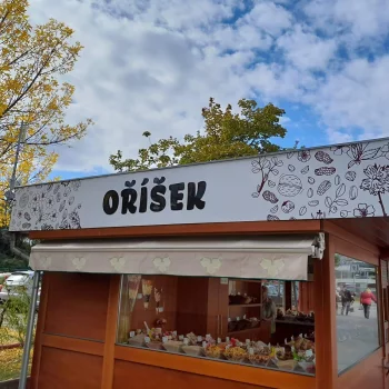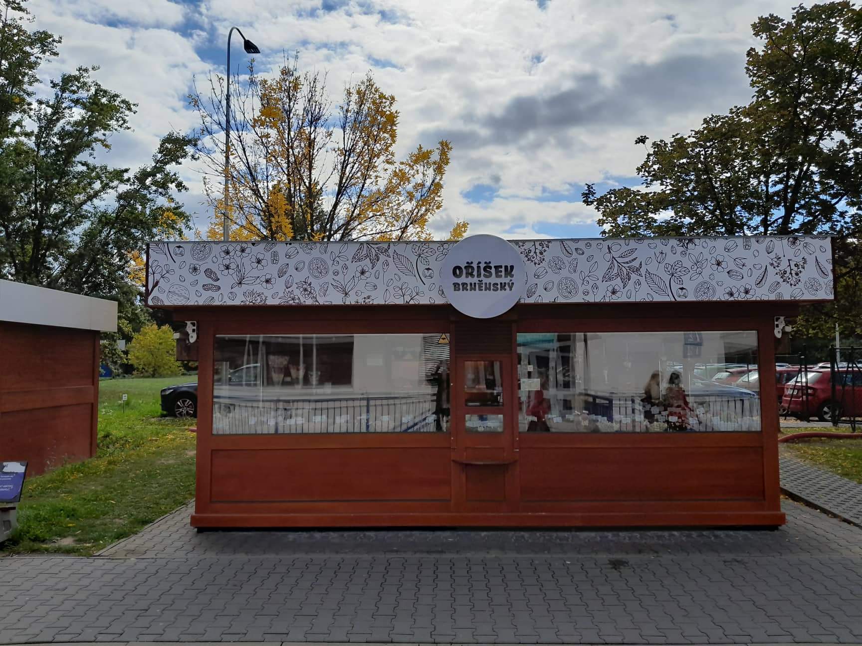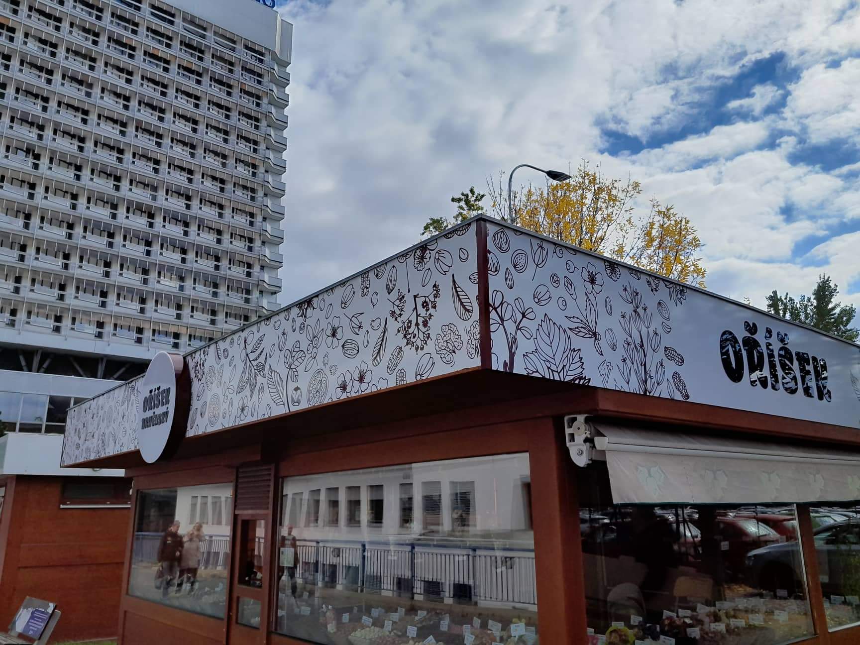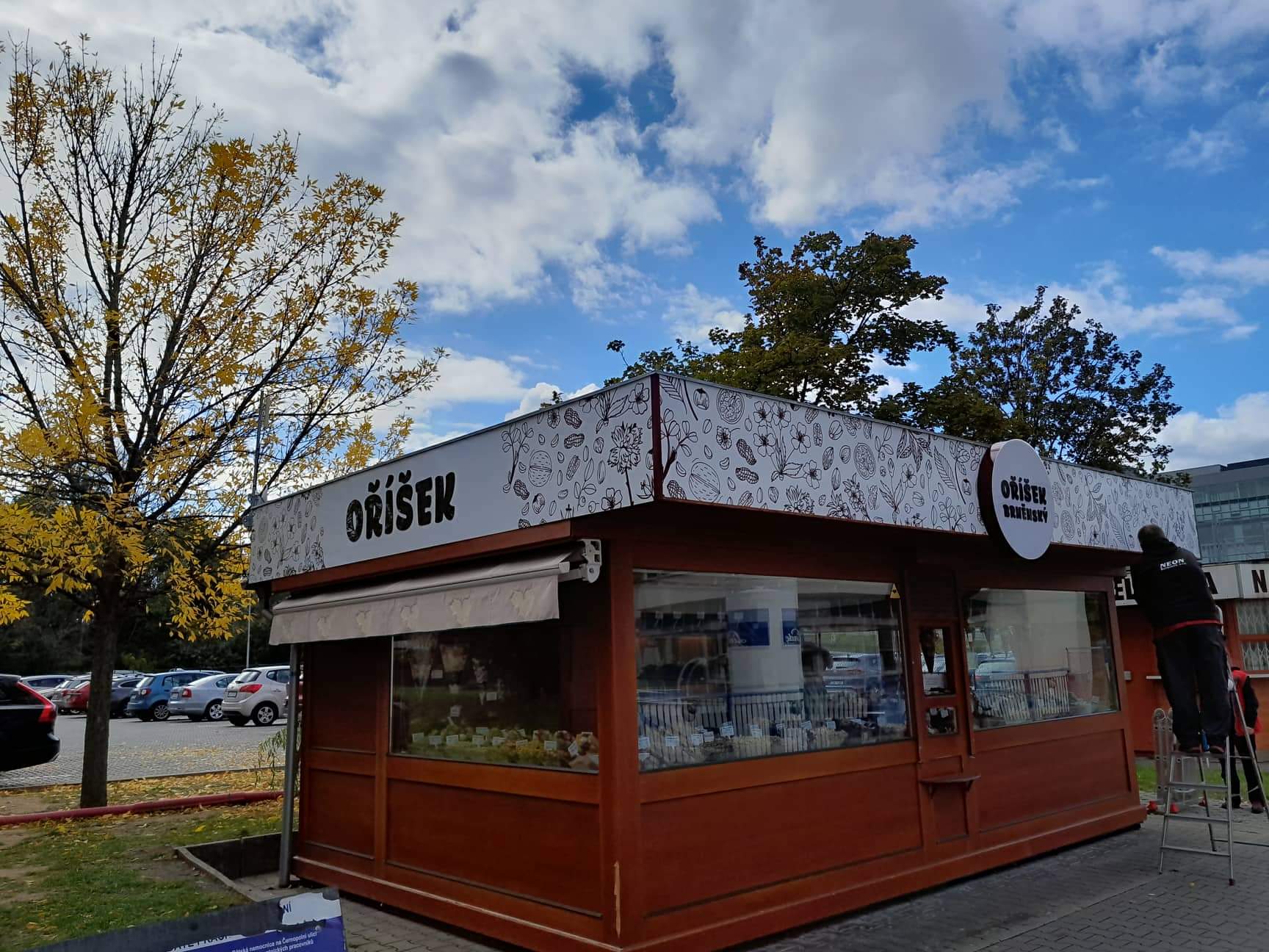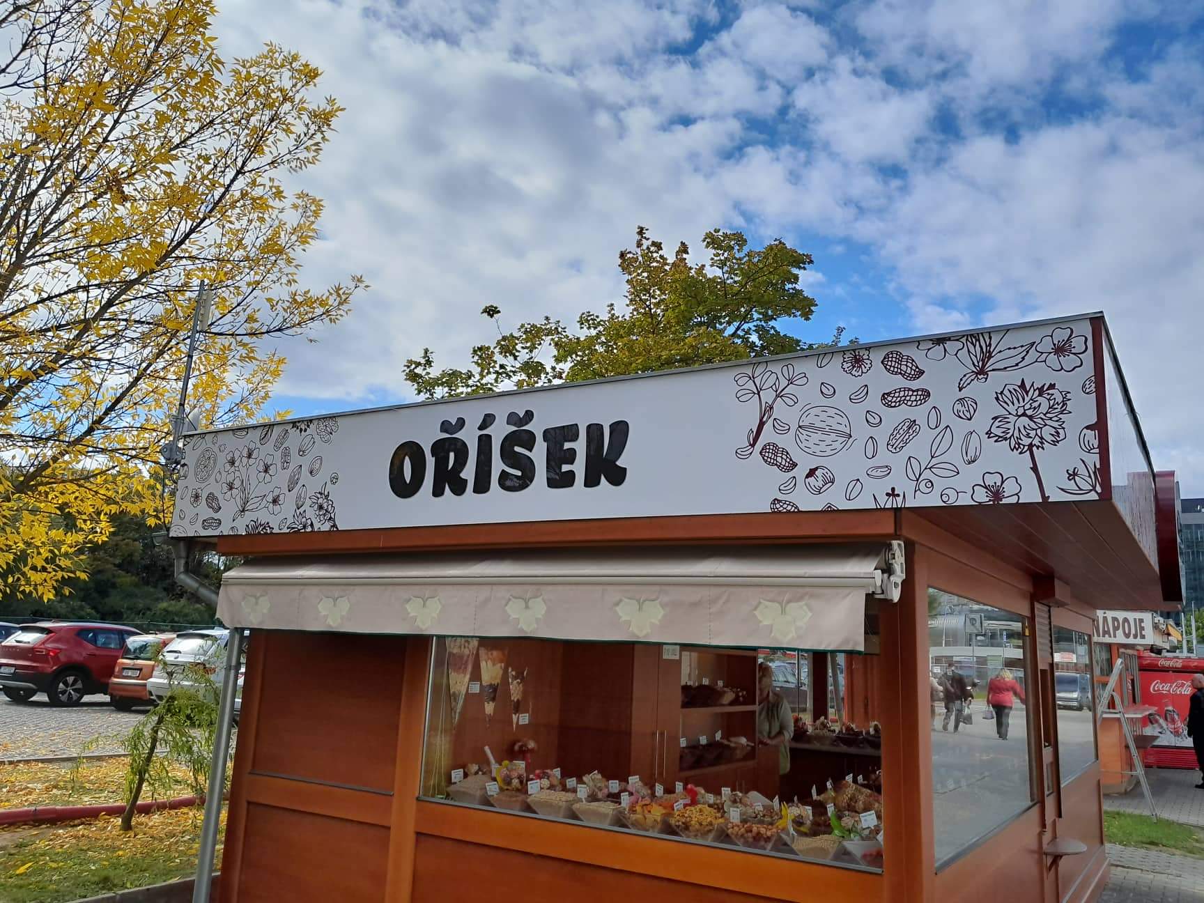 Nová vizáž stánku s prodejem oříšků je řešena s důrazem na výraznou prezentaci a odolnost materiálů. Vrchní límec stánku je vyroben z hliníkového sendvičového materiálu (Bond) a opatřen tištěnou grafikou s ochrannou laminací, která zajišťuje barevnou stálost a odolnost vůči povětrnosti.