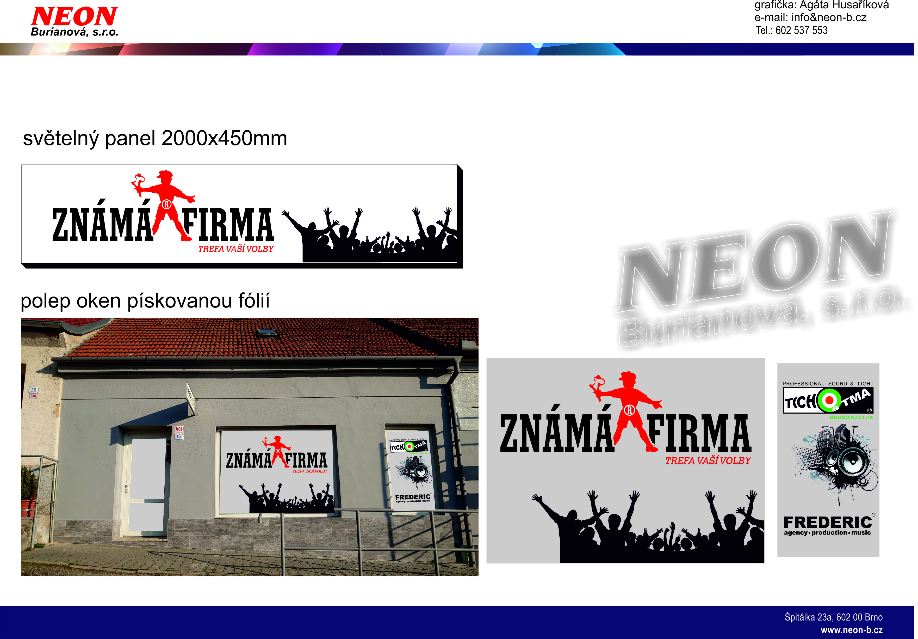 Všechny položky jsou povinné. Vyplněním a odesláním výše uvedeného formuláře uděluji souhlas se zpracováním osobních údajů, obsažených ve formulaří, firmě: NEON Burianová, s.r.o., Špitálka 23a, 602 00 Brno, IČ: 29186668 za účelem nastartování možné obchodní kumunikace související s našim podnikáním. Tento souhlas uděluji firmě do odvolání, a to v rozsahu nezbytném k zajištění účelu tohoto souhlasu.