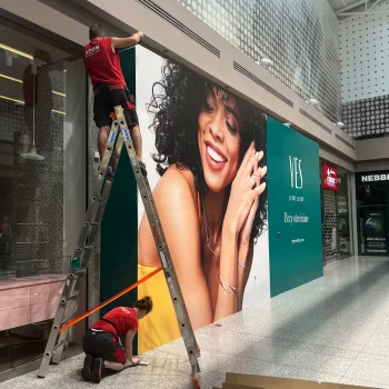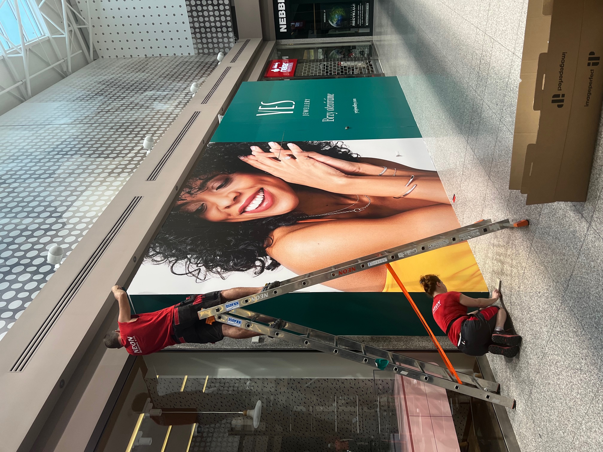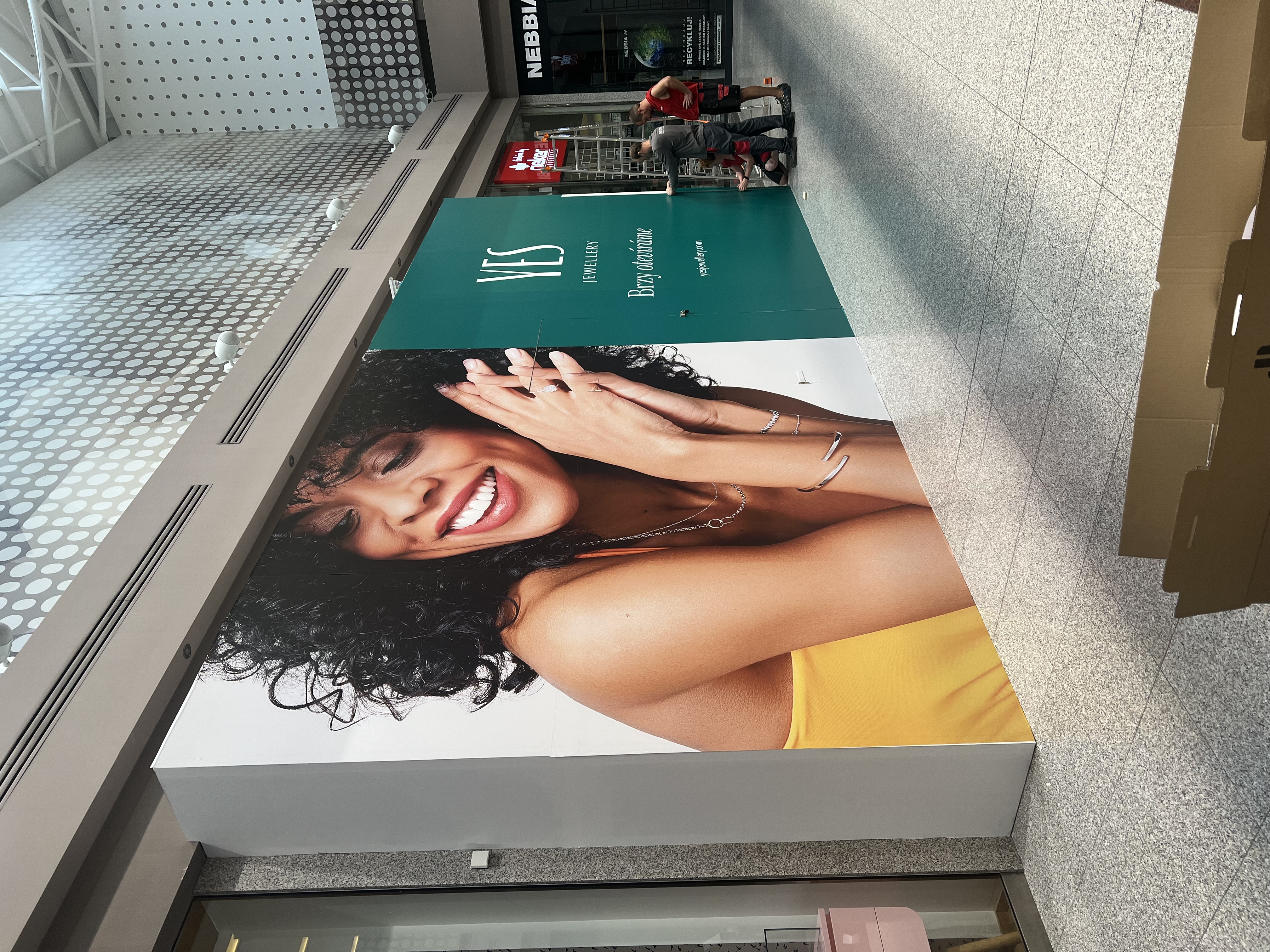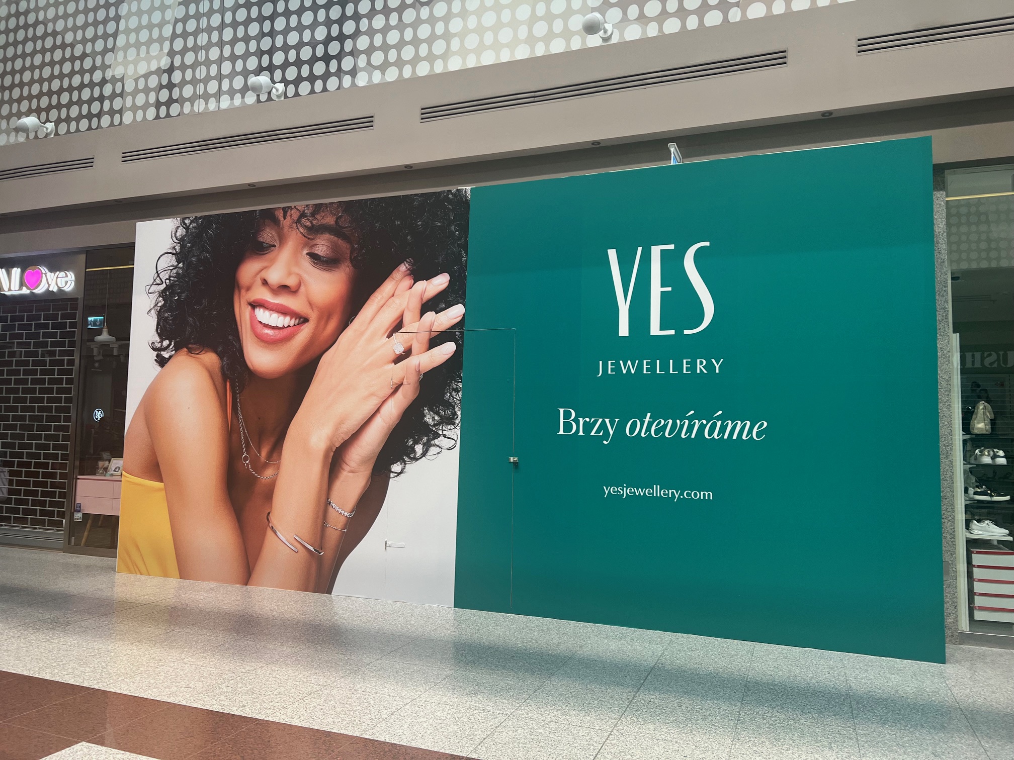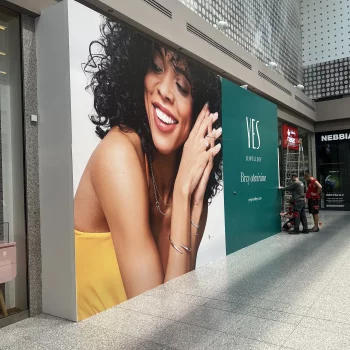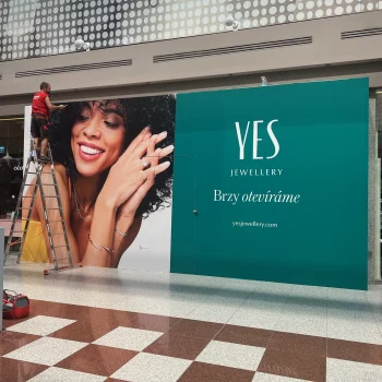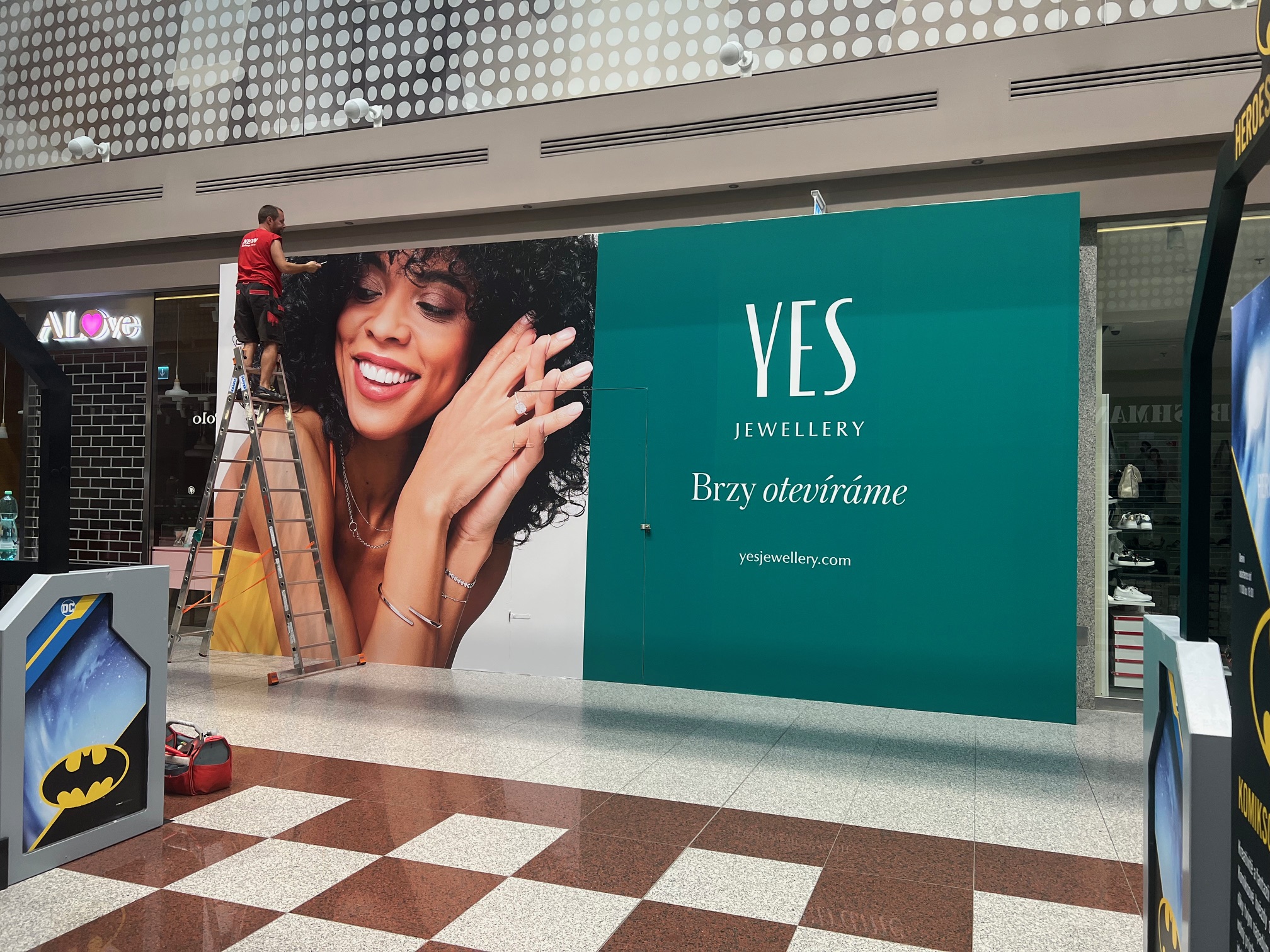 Při výstavbě nové prodejny je prostor dočasně zakryt sádrokartonovou konstrukcí, která je opatřena reklamním polepem nové značky. Grafika je realizována formou velkoformátového tisku na monomerickou fólii v ekonomickém provedení, s ohledem na dočasný charakter instalace do doby otevření provozovny.